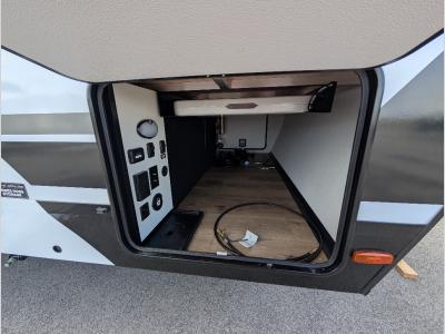Grab your hiking boots and your sense of adventure for fun camping trips in this single slide out travel trailer. The rear booth dinette includes overhead storage for your things and the sofa slide out is in great view of the 40" HDTV. There is also a fireplace here that will make your space feel more like home plus more storage space, including a pantry with pull out trays and storage above the 10 cu. ft. 12V refrigerator. A walk-through bath will take you to the front master bedroom with a queen bed, wardrobe nightstands, plus its own exterior entry door!