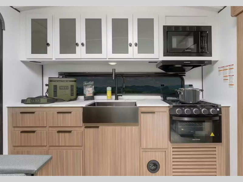 Sleeps 5 Slides 1 Length 28 ft 8 in Ext Height 11 ft 1 in Hitch Weight 715 lbs Dry Weight 6065 lbs Cargo Capacity 1535 lbs Fresh Water Capacity 54 gals Grey Water Capacity 76 gals Black Water Capacity 38 gals Tire Size ST205/75R14D Furnace BTU 30000 btu Available Beds Queen Refrigerator Type French Door 12V Refrigerator Size 10 cu ft Cooktop Burners 3 Number of Awnings 1 LP Tank Capacity 20 lbs Water Heater Type Girard Tankless AC BTU 13500 btu Awning Info 19' Power w/LED Light Strip Axle Count 2 Number of LP Tanks 2 Shower Type Standard Similar Floorplans