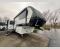 You're going to love every minute spent in this spacious fifth wheel that can sleep four. There is an inviting rear living area with a 72" tri-fold sofa and theater seating across from the telescoping entertainment center and fireplace. The chef of your group can whip up dinner on the three burner cooktop or in the 30" residential microwave, and there is a 16 cu. ft. refrigerator that even opens when with the slide out is in. You will also enjoy the kitchen island with a farmhouse sink and roller cover, dual trash bins with a Stow N' Go paper towel holder, plus convenient dog bowls for your furry friends. You can store all your paper goods and snacks in the 84" pantry with adjustable shelving, and there is a hutch for nice dishes plus shoe storage in this model as well. Head to the front master bedroom where you'll find a queen bed with a TV, a large slide out with a wardrobe and a chest of drawers, plus a spacious bath.